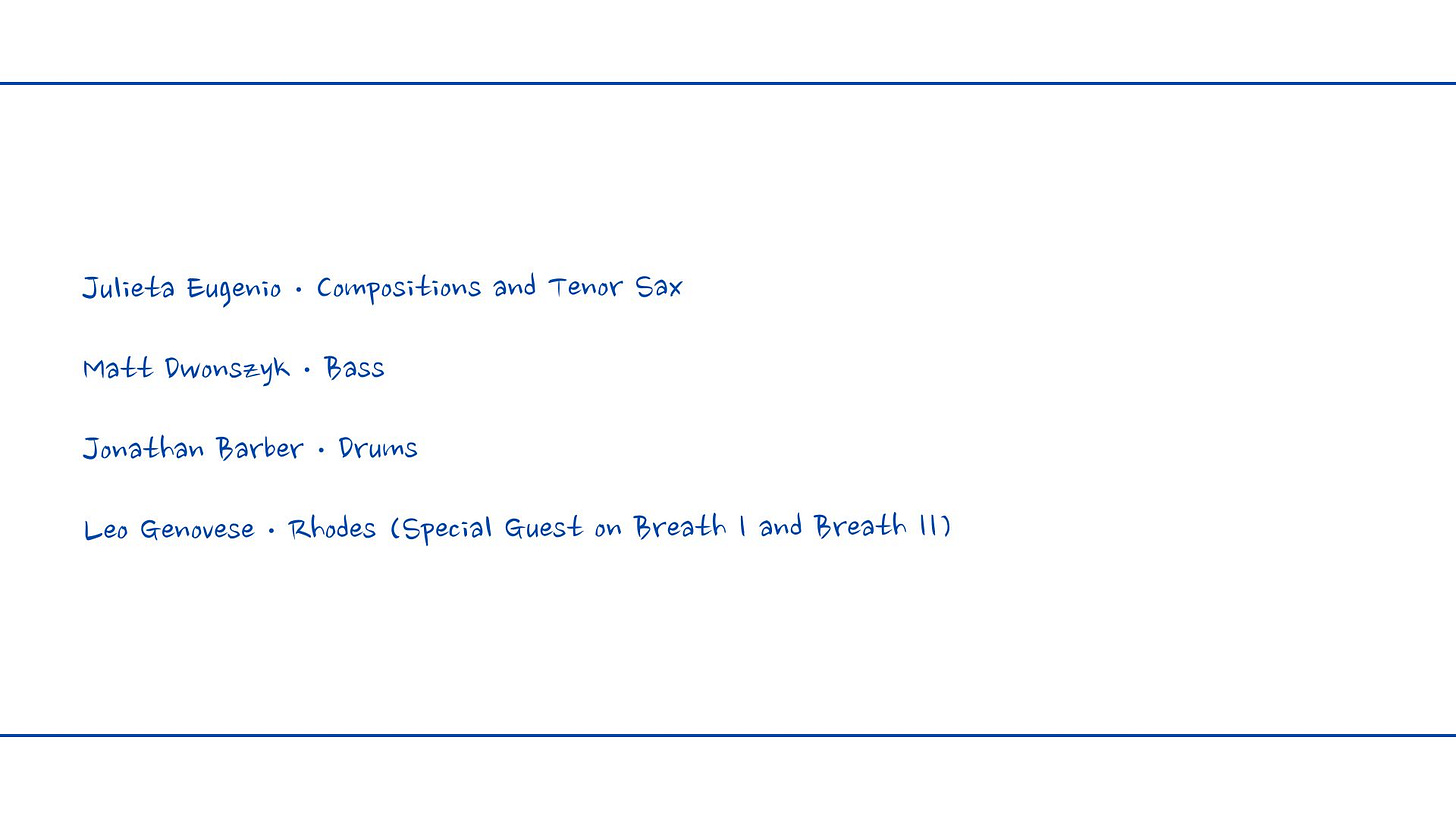 Eugenio embraces the chordless Jazz trio format and pays homage to the legendary Sonny Rollins, adding a flavorful twist with Leo Genovese’s Rhodes piano on two tracks. Across the album’s ten tracks, all originals by Eugenio except for Duke Ellington’s timeless “Sophisticated Lady,” her compositional brilliance shines.